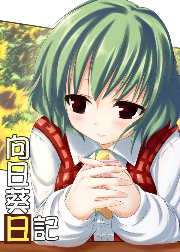 1girlascotfemale focusflowergreen hairlight smileown hands claspedown hands togetherplaid clothesplaid vestred eyesshort hairsolosunflowerupper bodyvest