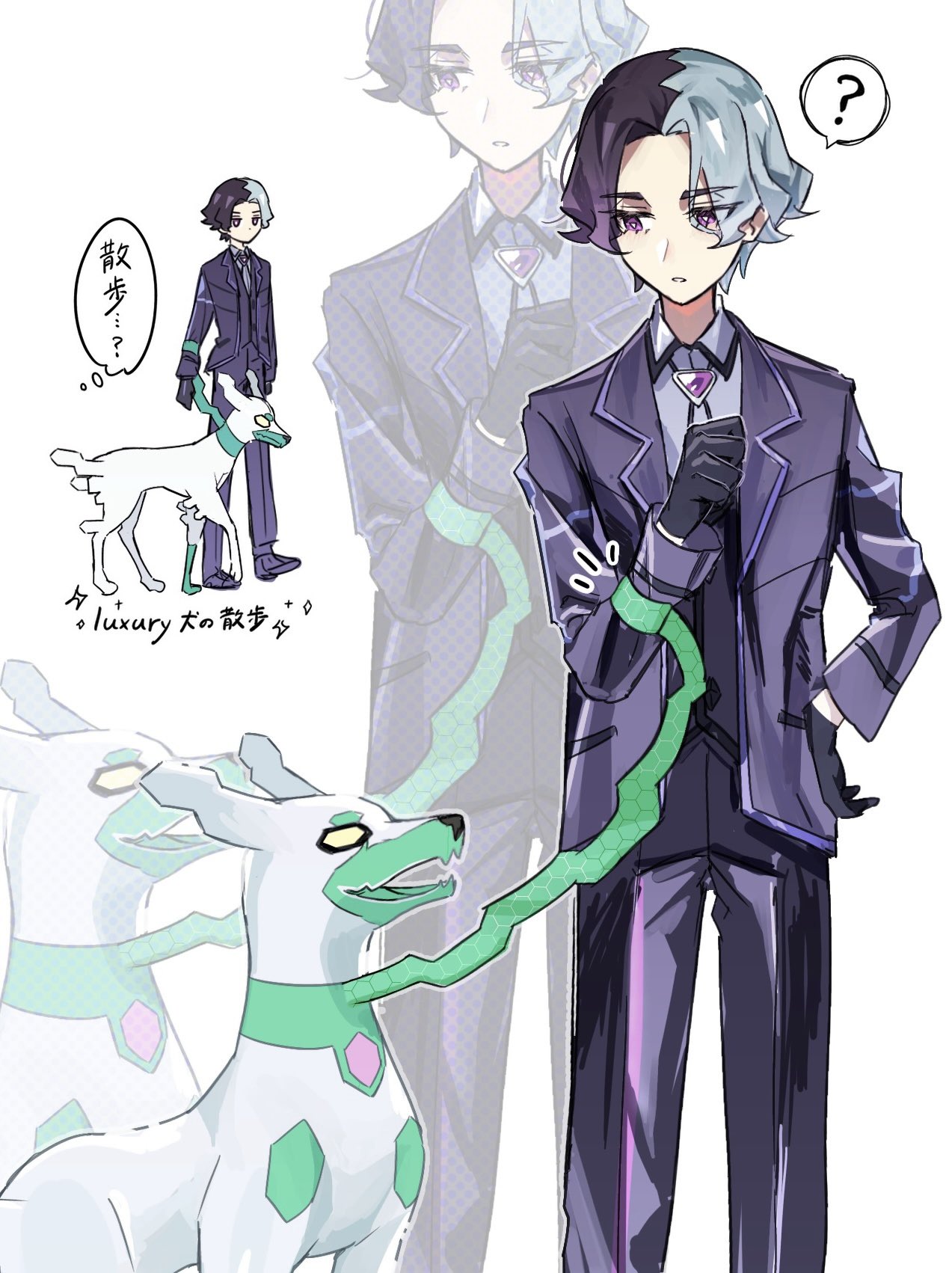 1boyalternate colorblack pantscollared shirtgen 6 pokemongloveshand on own hipjacketlegendary pokemonlong sleeveslooking downmale focusmultiple viewspantsparted lipspokemon (creature)purple eyesshiny pokemonshirtshoesspeech bubblespoken question markthought bubblezoom layerzygarde (10)