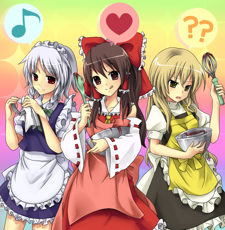 :q1boy3girlsblonde hairbrown eyesbrown hairchocolatechocolate makingcookingdetached sleevesfemale focusfoodhairbandheartlong hairmaidmultiple girlsparodyred eyesribbonshort hairtonguetongue outyellow eyes