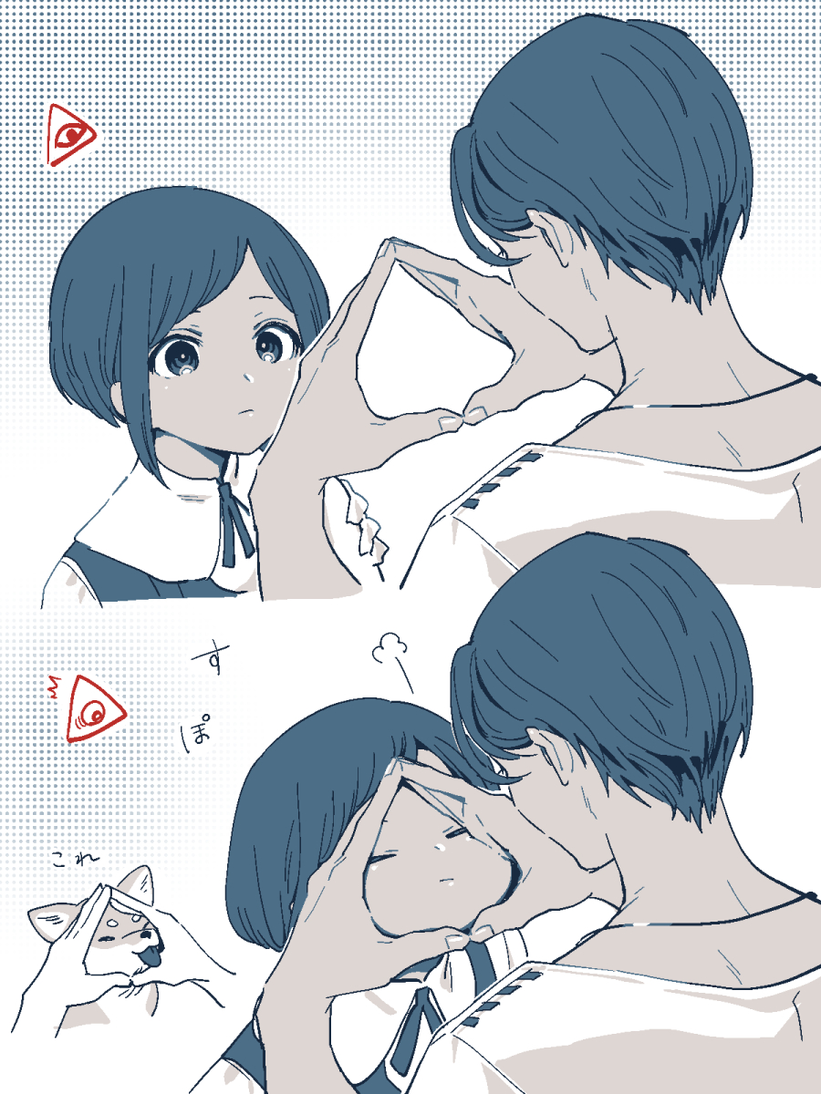 1boy1girlblue eyesblue hairclosed eyesclosed mouthcollared shirtdogeye of providenceface in handsfrilled shirtfrillshands uplimited palettelooking at anothermultiple viewspuff of airshiba inushirtshort hairsnoot challengeswept bangstonguetongue outtriangle handsupper body