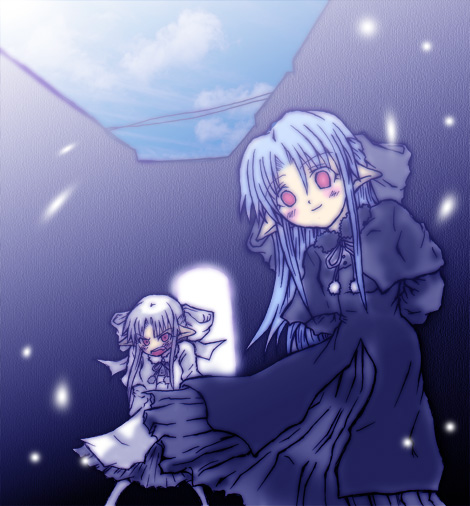 00s2girlsangryblue hairblushcloudhalf updolong hairmultiple girlspointy earsred eyesribbonskysmilesnowwhite hair