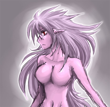 1990s (style)1girlbreastscolored skinfemale focusgradient backgroundlong hairnavelno nipplespink hairpink skinpointy earsred eyesretro artstylesolo