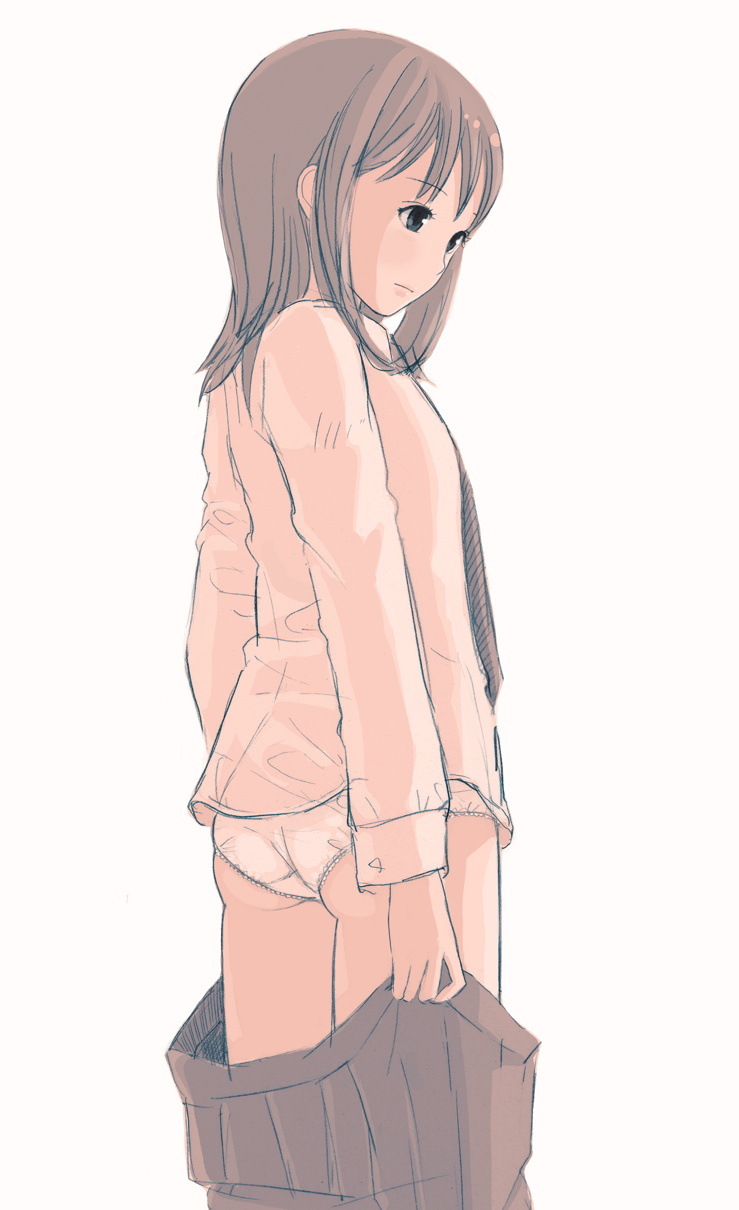 1girlassbrown hairclothes pullfemale focuslong hairpantiesskirtskirt pullsolounderwearundressingwhite panties