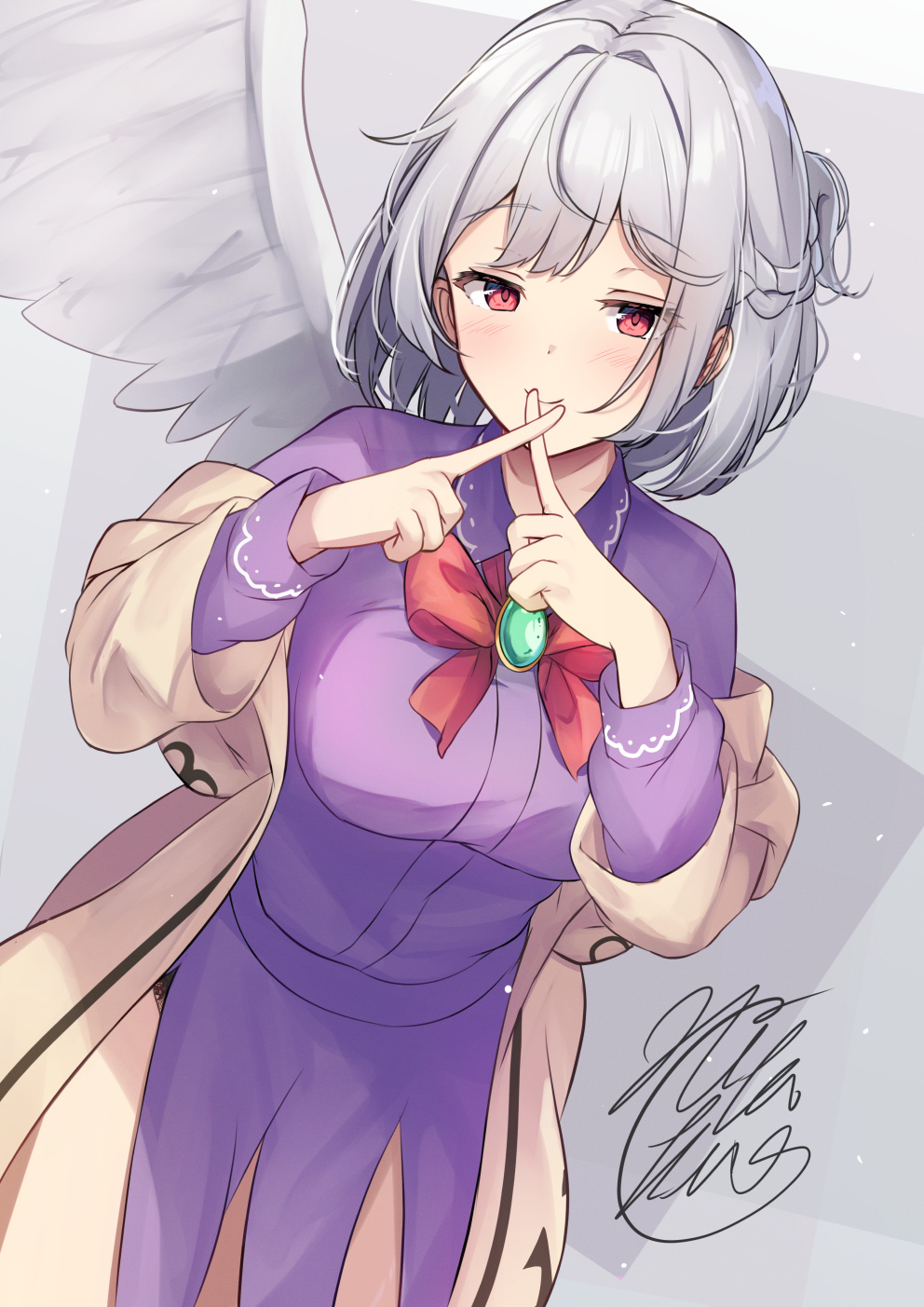 1girlblushbowbowtiebraidbroochbrown coatcoatdressfeathered wingsgrey backgroundgrey hairjewelrylong sleeveslooking at viewermedium hairpurple dressred bowred bowtiered eyessimple backgroundsingle wingsolowingsx fingers