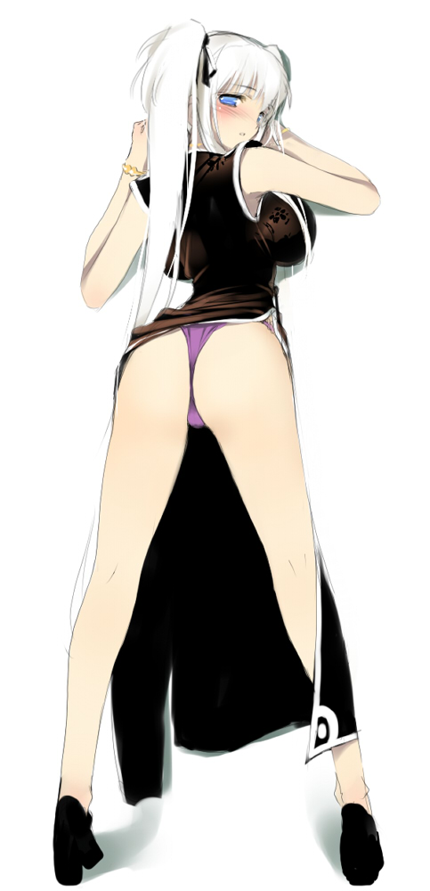 1girlagainst wallassbent overblue eyesblushbreast pressbreastschina dresschinese clothesdressfemale focushigh heelshuge breastslegslong hairlooking backpantiesshoessolotwintailsunderwearwhite hair
