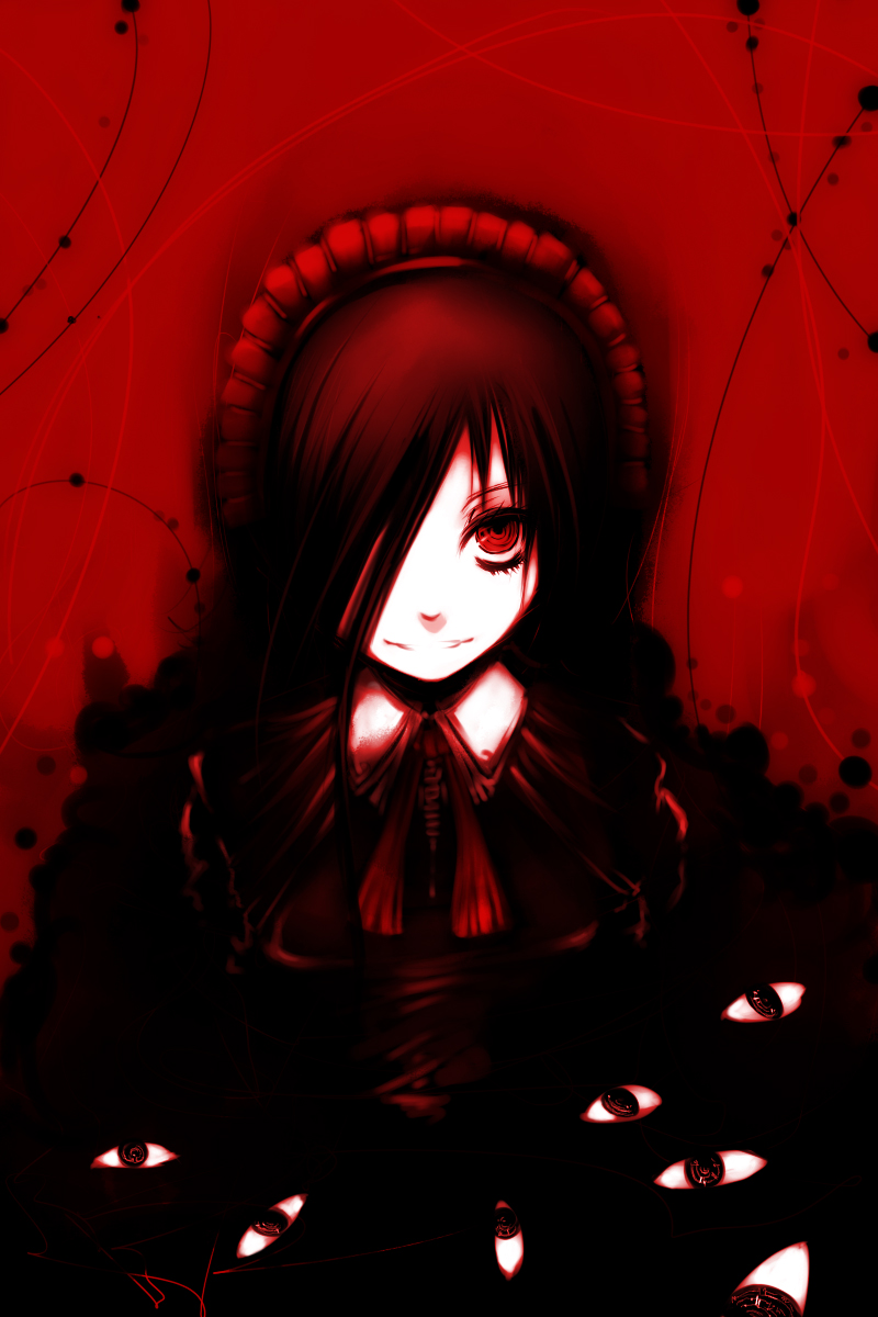 1girlblack haireye focusfemale focusgrinhair over one eyelong hairmaidmaid headdressmonsterred backgroundred eyesred themesmilesolo