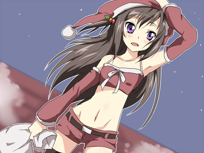 00s1girlarmpitsbrown hairchristmasdetached sleevesfemale focusgenderswapgenderswap (mtf)hatlong hairmidriffpurple eyessanta costumesanta hatshortssolothighhighs
