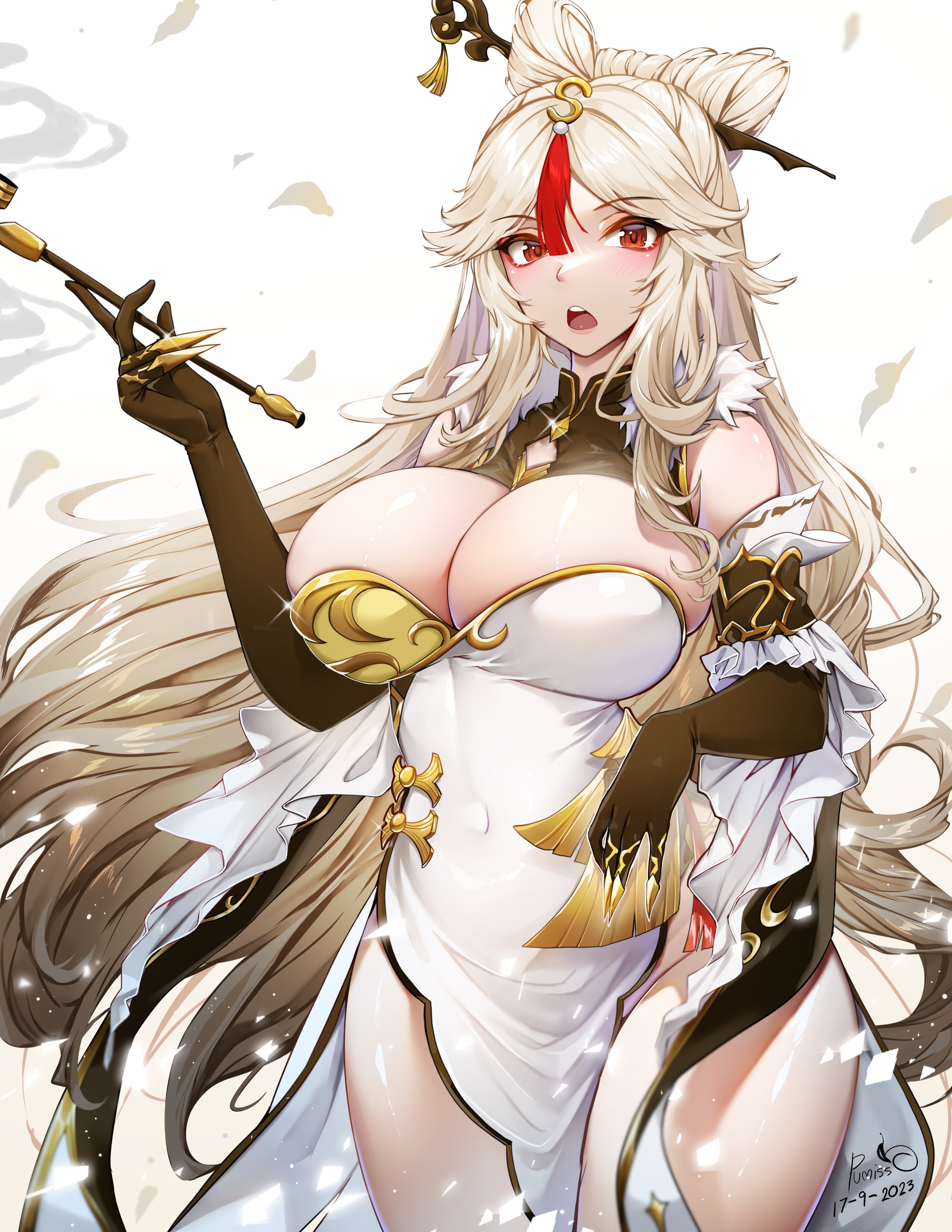 1girlartist nameblack glovesbreastschinese clothesclaw ringcleavage cutoutclothing cutoutdetached sleevesglovesgrey hairhair bunhair ornamenthair sticklarge breastslong hairred eyessimple backgroundsolotasselthighsvery long hairwhite background