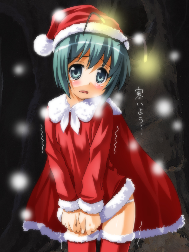 1girlantennaeblushbottomlesscapechristmascoldcovering crotchcovering privatesfemale focusgreen eyesgreen hairhatmatching hair/eyesno pantsopen mouthoutdoorspantiessanta costumesanta hatshort hairsnowsolotearsthighhighstremblingunderwearwhite panties