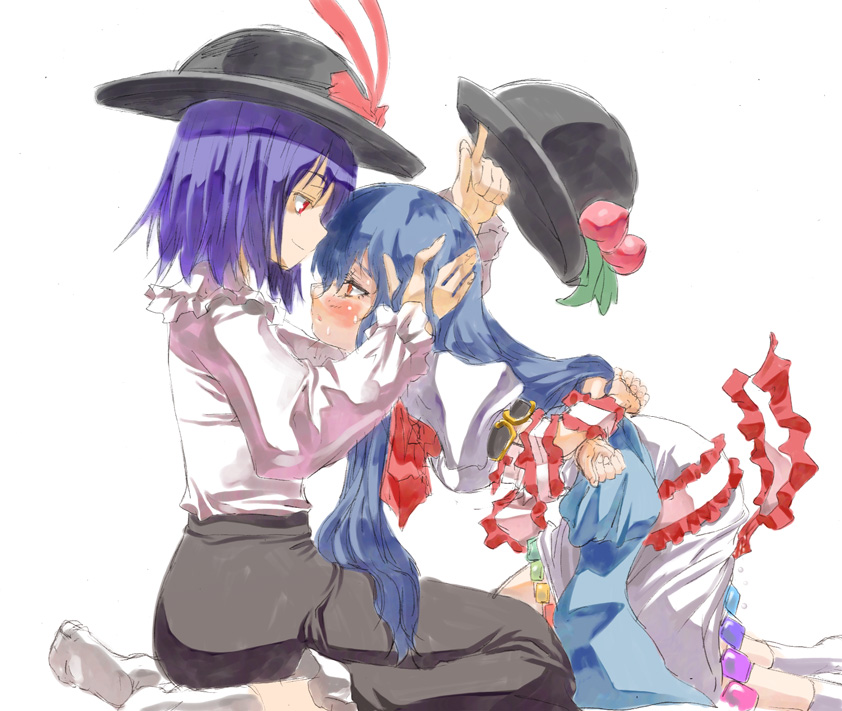 2girlsbdsmblue hairblushbondageboundbound wristsfemale focusfoodfrillsfruithatholdingholding unworn hatleafmasochismmultiple girlspeachpurple hairred eyesshawlsweatunworn hatunworn headwearyuri