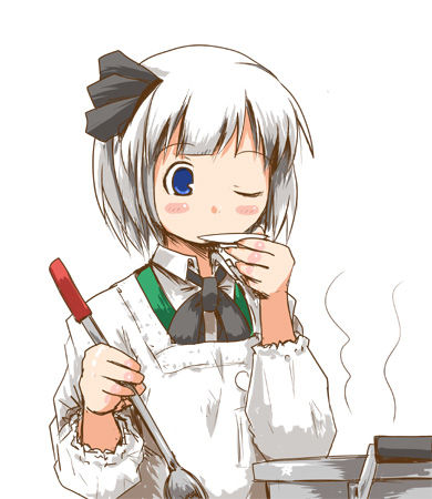 1girlapronblue eyesbowcookingfemale focushairbandladleplateshort hairsolotastingtasting plateupper bodywhite background