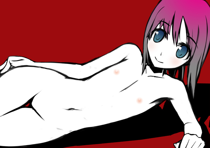 1girlblue eyesbrown hairfemale focusflat chestgradient hairlolilooking at viewerlyingmulticolored hairnipplesnudeon sidepurple hairshort hairsmilesolothigh gap