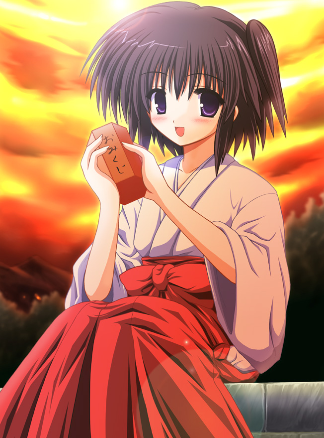 1girlfemale focushakamahakama skirtjapanese clothesmikopurple eyespurple hairred hakamashort hairskirtsolosunset