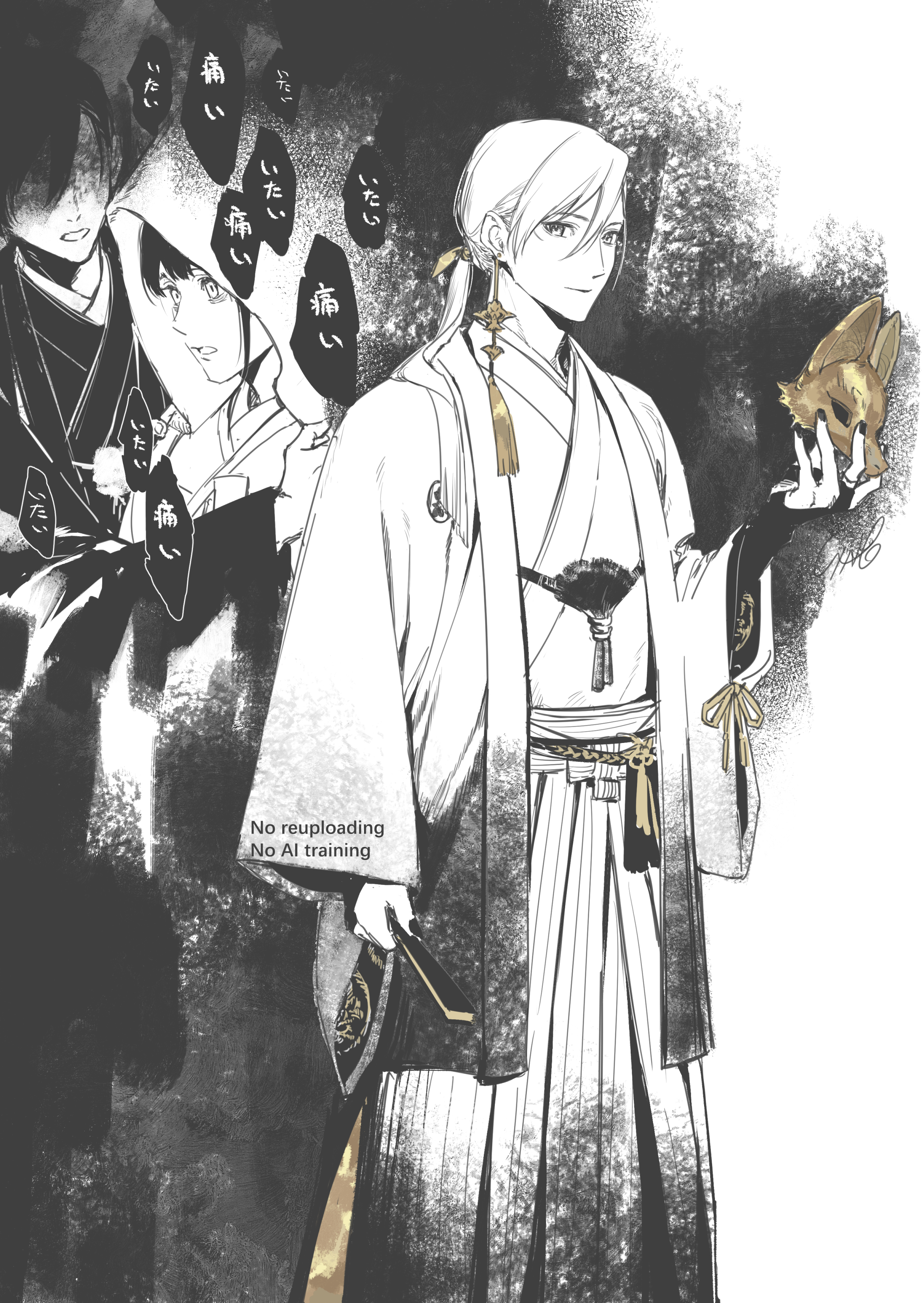 enjoji jin, evil eye (dandadan), dandadan, commentary request, highres, 2boys, back-to-back, collarbone, double finger gun, dual persona, earrings, finger gun, glint, glowing, glowing eyes, grin, jewelry, kuzumochi ruu, looking at viewer, male focus, multiple boys, muscular, muscular male, nude, pectorals, possessed, puckered lips, purple eyes, red hair, sharp teeth, short hair, smile, teeth, third eye, topless male, upper body, white hair, yellow background
