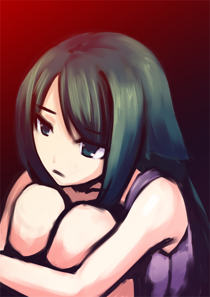 1girlblue eyesbrown hairclose-upfemale focusgreen eyesgreen hairhugging own legslong hairmatching hair/eyessolo