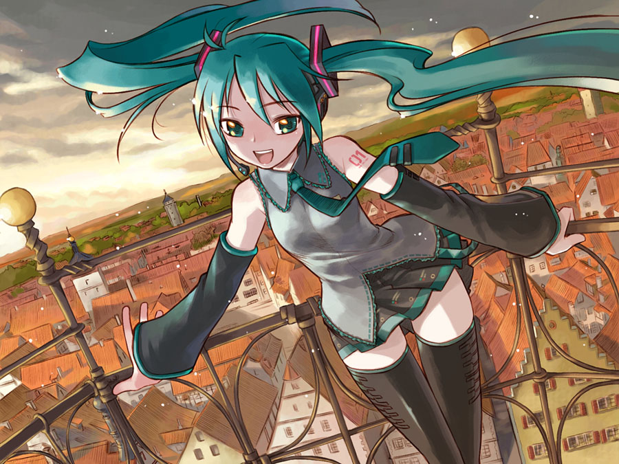 aqua eyesaqua haircitydetached sleevesheadsetlong hairnecktieskirtsolothighhighstwintailszettai ryouiki