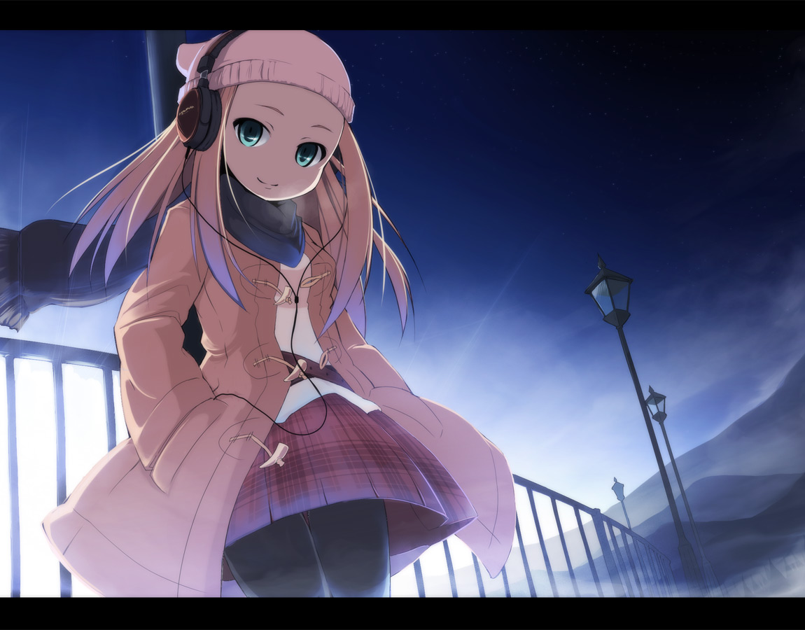 1girlaqua eyesblack pantyhosebreathbrown haircoatfemale focushands in pocketshatheadphoneslong hairpantyhosesolo