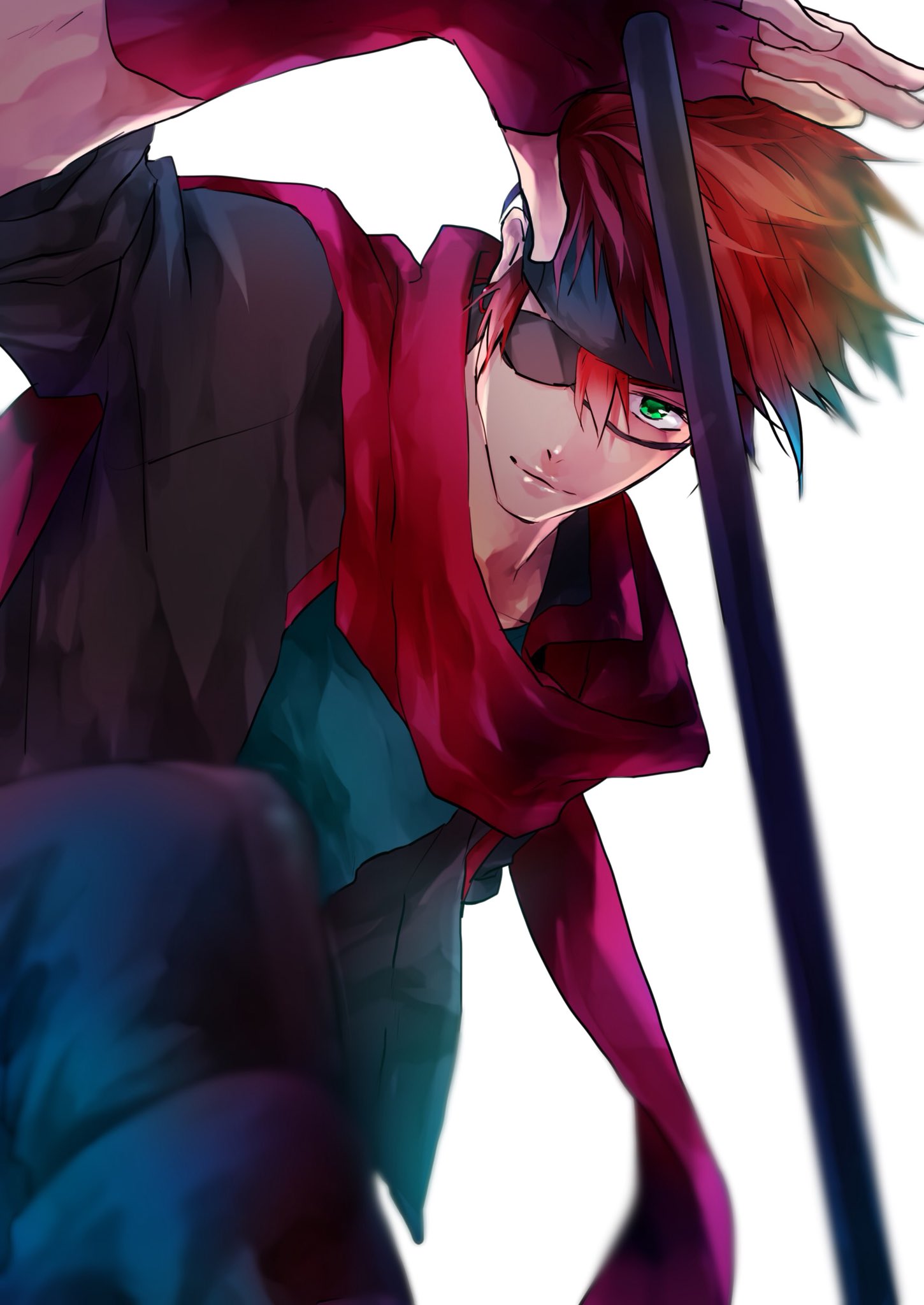 1boyblack headbandblack jacketblack order uniformblack pantsblue shirtcollared jacketearringseyepatchfingerless glovesfrom belowglovesgradient hairgreen eyeshair between eyesheadbandholdingholding staffhoop earringsjacketjewelrykoshian (mruc9)light smilelipslong sleeveslooking at viewerlooking downmale focusmulticolored hairone eye coveredopen clothesopen jacketorange hairpantsred glovesred hairred scarfscarfshirtshort hairsidelockssimple backgroundsingle glovesleeves rolled upsolosquattingstaffstriped clothesstriped jacketvertical-striped clothesvertical-striped jacketwhite background