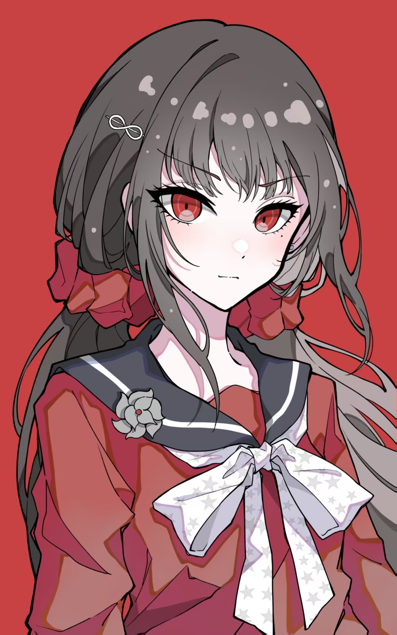 1girlblack sailor collarbowbowtiebrown hairclosed moutheyelasheshair ornamenthair scrunchielight blushlight smilelong hairlong sleeveslooking at viewerlow twintailsmolemole under eyered backgroundred eyesred scrunchiered shirtringed eyessailor collarschool uniformscrunchieshirtsolostar (symbol)star printtwintailsupper bodyvery long hairwhite bowwhite bowtie