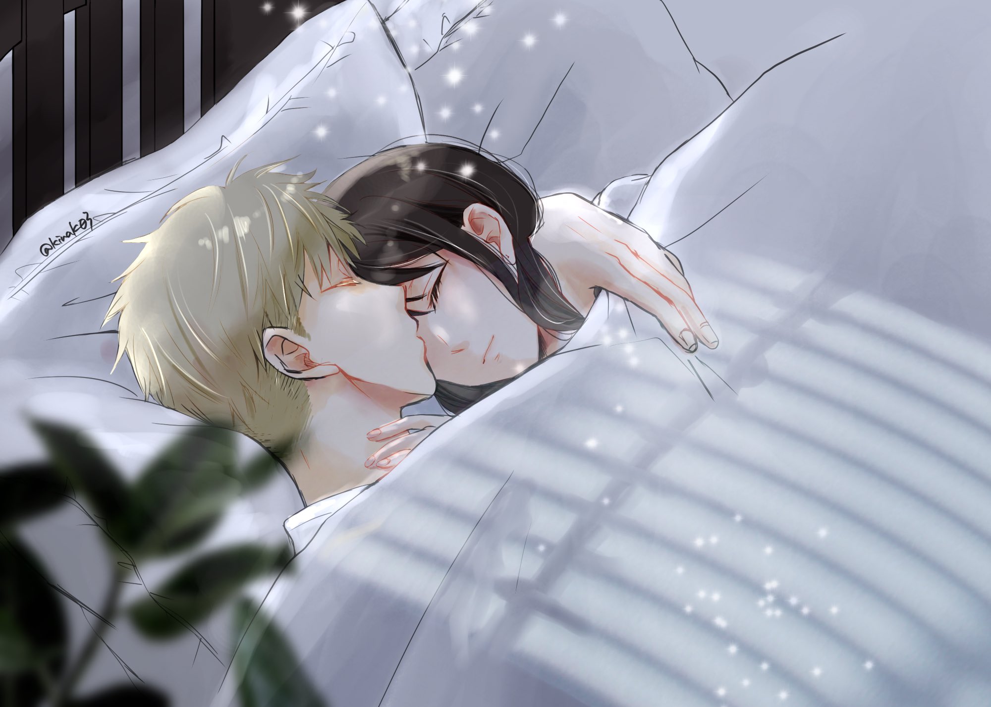 1boy1girlarm around neckblack hairblonde hairblurryblurry foregroundclosed eyesclosed mouthcouplecuddlinghand on another's neckheterokinak03long hairon bedplantshirtshort hairsidelockssleepingtwitter usernameunder coversupper bodywhite shirt
