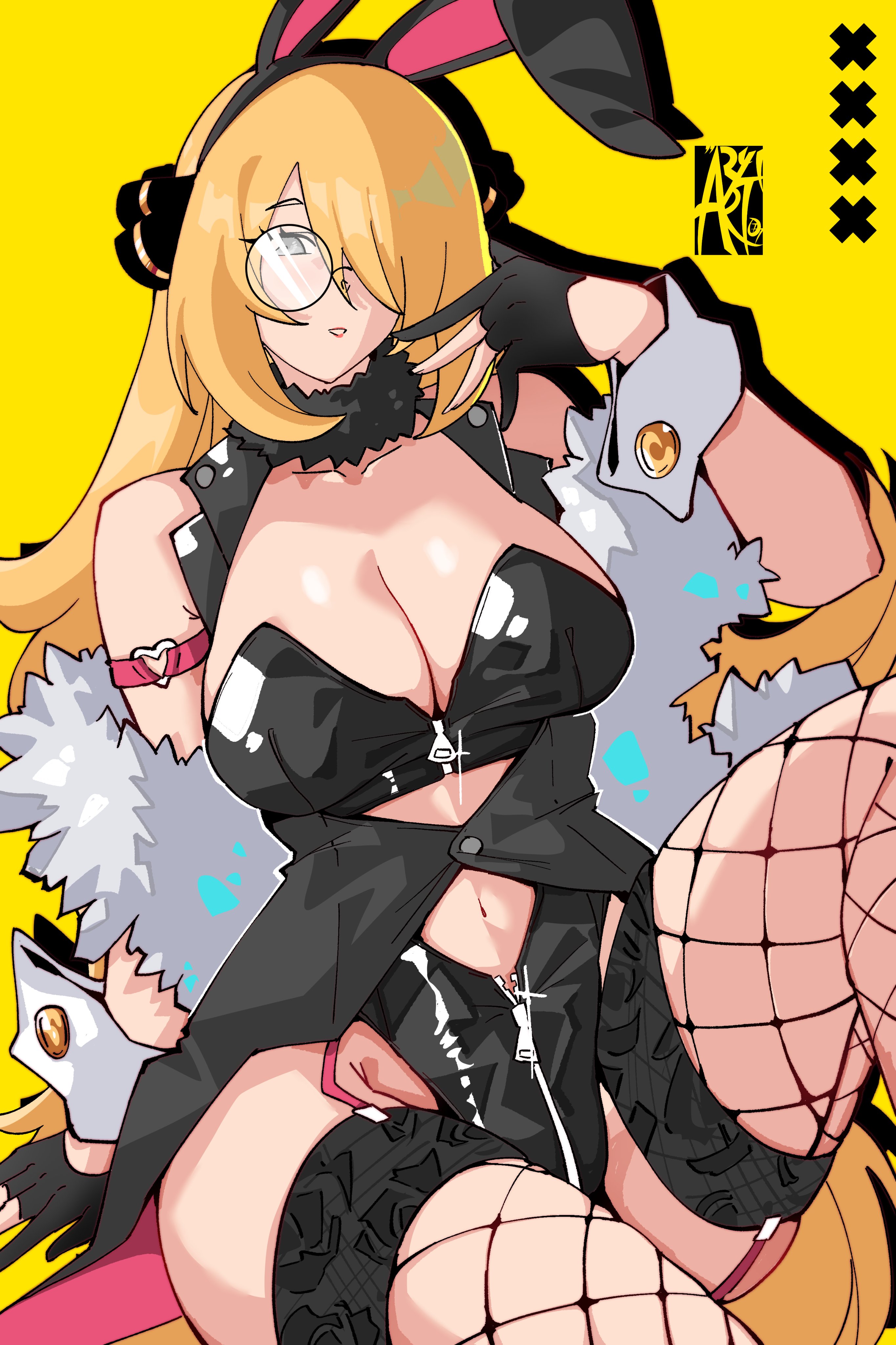 1girlalternate costumeanimal ear hairbandanimal earsbespectacledblack glovesblack leotardblonde hairbreastscleavageclothing cutoutcollarbonefake animal earsfeather boafishnet thighhighsfishnetsfur collarglassesglovesgrey eyeshair ornamenthair over one eyehairbandhand uplarge breastsleotardlong hairlooking at viewernavelnavel cutoutparted lipspartially fingerless glovesrabbit ear hairbandrabbit earssimple backgroundsittingsolothighhighsthighsvery long hairwrist cuffsyellow background