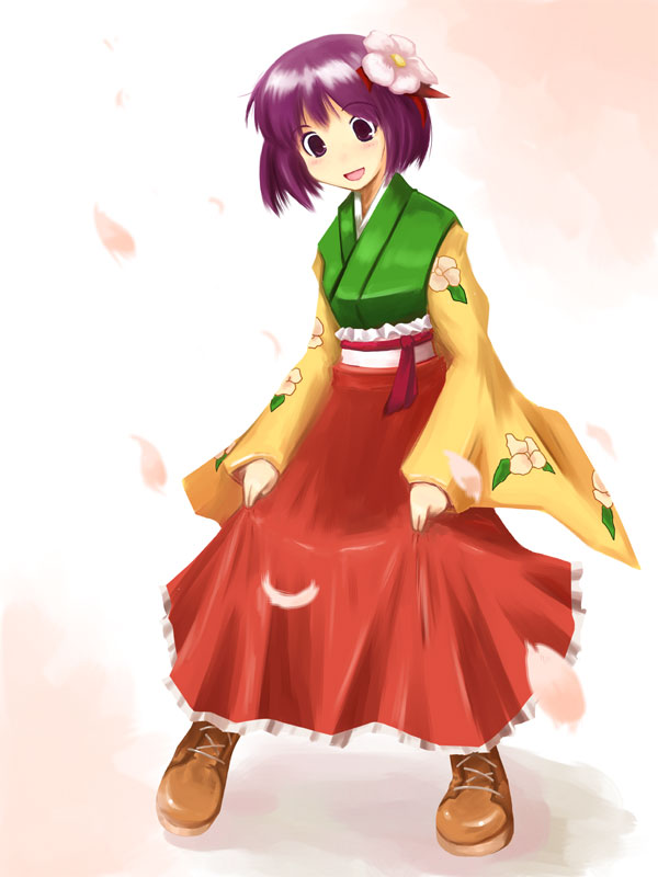 1girlfemale focusflowerfull bodygradient backgroundjapanese clotheskimonopurple eyespurple hairshort hairsolostandingwhite background