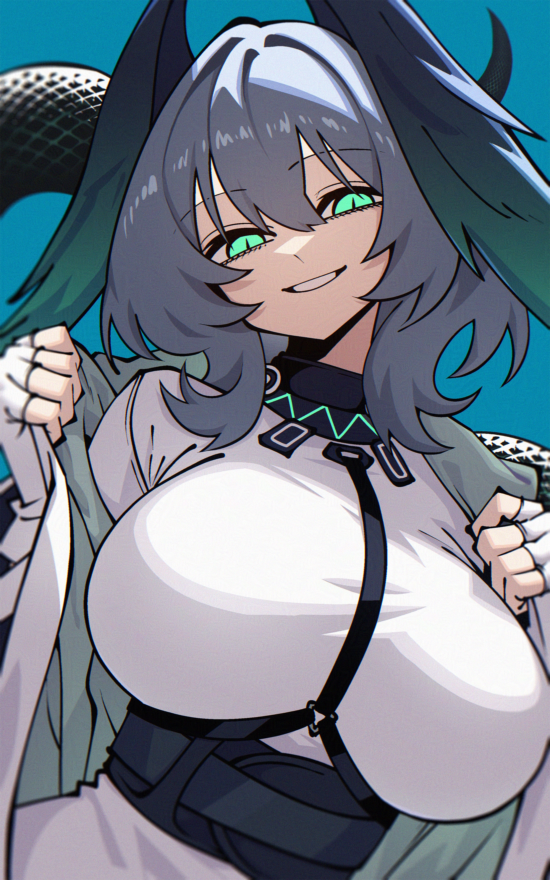 1girlblue backgroundbreastsgreen eyesgrey hairhead wingslarge breastslooking at viewershirtsimple backgroundsmilesnake tailsolotailwhite shirtwings