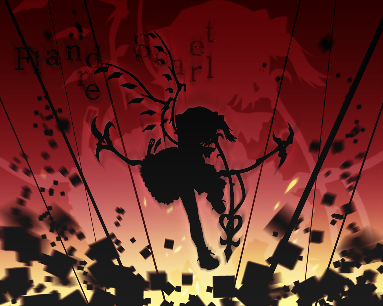 1girlbowcubedemon wingsdressfemale focusflyingfull bodygradient backgroundhathat bowholdingholding weaponlaevateinpolearmshoesside ponytailsilhouettesolospearweaponwingszoom layer