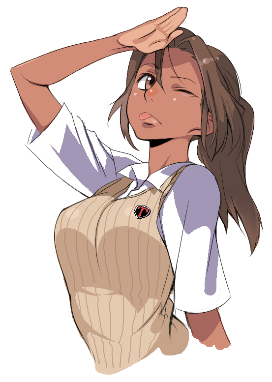 :p1girlbrazilbreastsbrown eyesbrown haircardigandark skindark-skinned femalefemale focuslarge breastsone eye closedponytailsaluteschool uniformsolosweater vesttonguetongue outwink