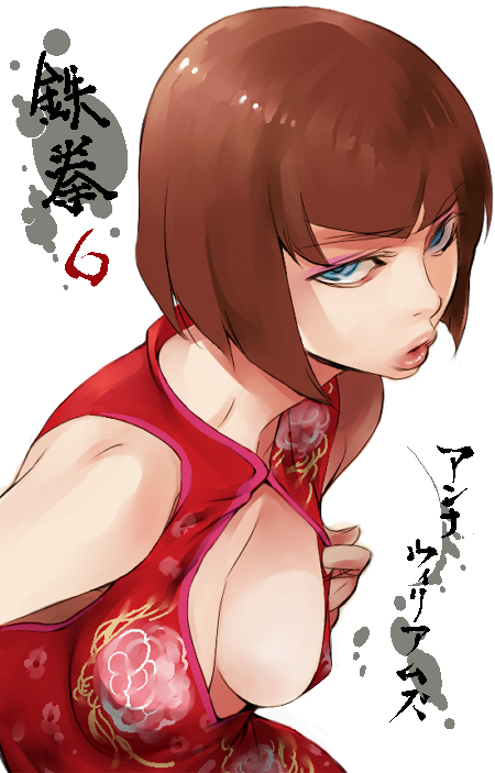 1girlblue eyesbob cutbreastsbrown hairchina dresschinese clothescleavagecleavage cutoutclothing cutoutdresseyeshadowfemale focuslipstickmakeupshort hairsolo