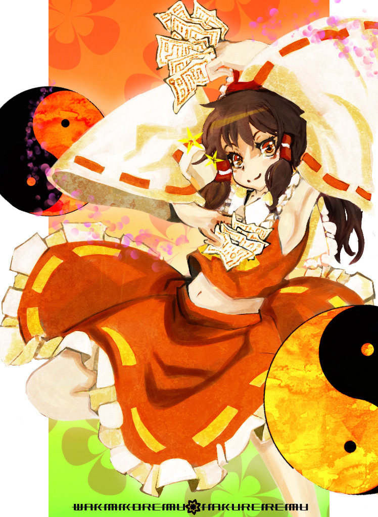 1girlarmpitsbrown hairdetached sleevesfemale focusgradient backgroundjapanese clothesmidriffmikonavelofudared eyesskirtsoloyin yang