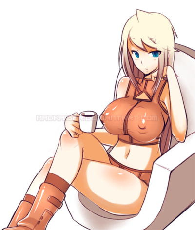 alternate costumeblonde hairblue eyesbodysuitbreastschaircoffeecovered erect nipplescrossed legshuge breastslong hairsittingwatermark