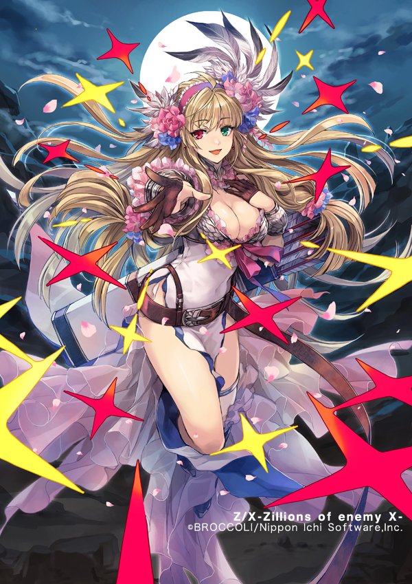 1girlahogeblonde hairbreastsbrown glovescleavagecopyright noticedressfloating hairflowerglovesgreen eyeshair flowerhair ornamenthairbandheterochromialarge breastslong hairlooking at viewermoonnightnight skyopen mouthoutdoorspink petalsreachingreaching towards viewerred eyesskysolosparklewhite dress
