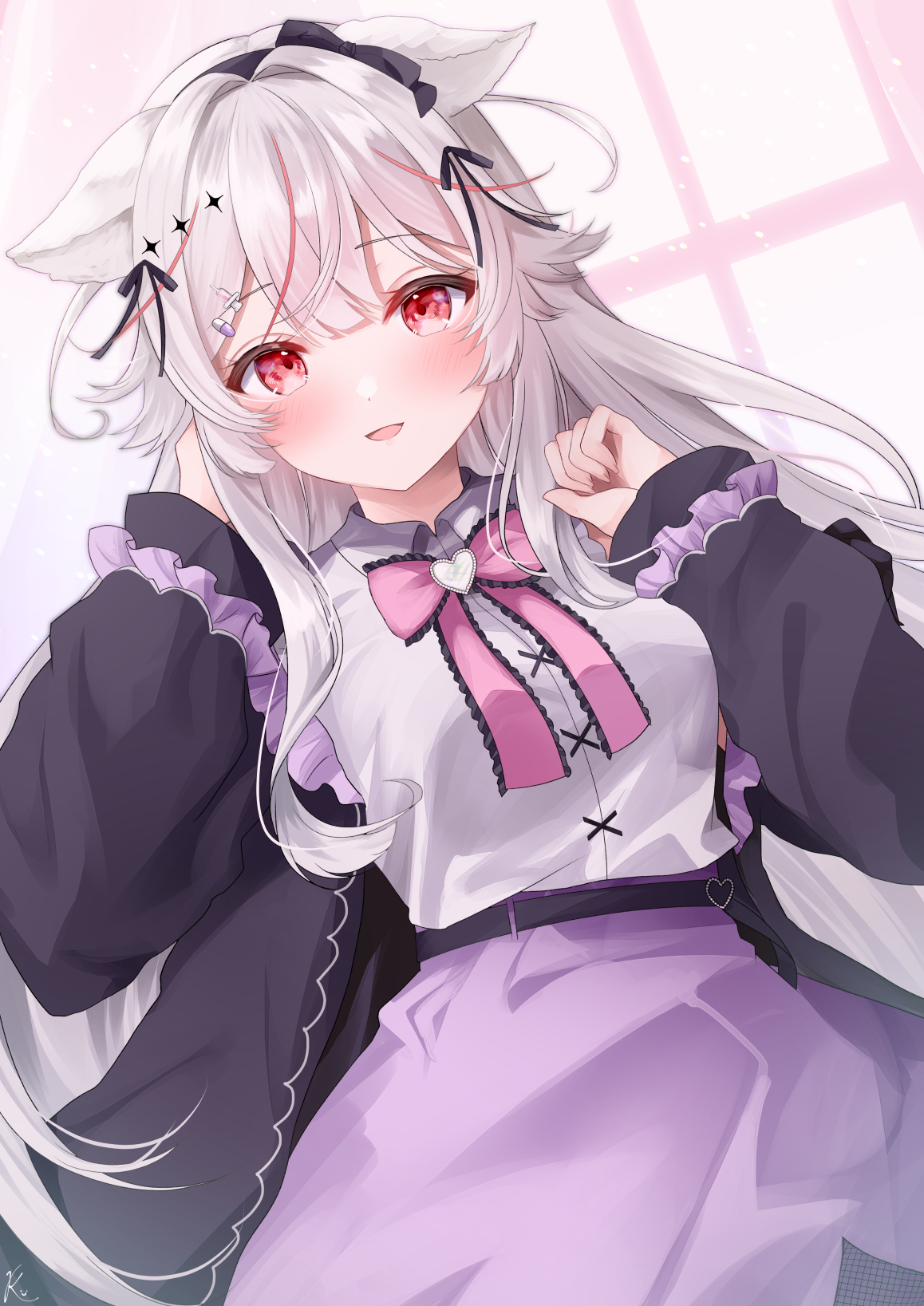 1girlanimal earsarm behind headarms upblack hairbandblack jacketblack ribbonblushcollared shirtdog earsdutch anglefingernailsfrilled jacketfrilled ribbonfrillshair intakeshair ribbonhairbandheart-shaped gemjacketlong hairlooking at viewermulticolored hairopen clothesopen jacketopen mouthpink ribbonpurple skirtred eyesred streaksribbonshirtskirtsmilesolostreaked hairvirtual youtuberwhite hairwhite shirtwindow