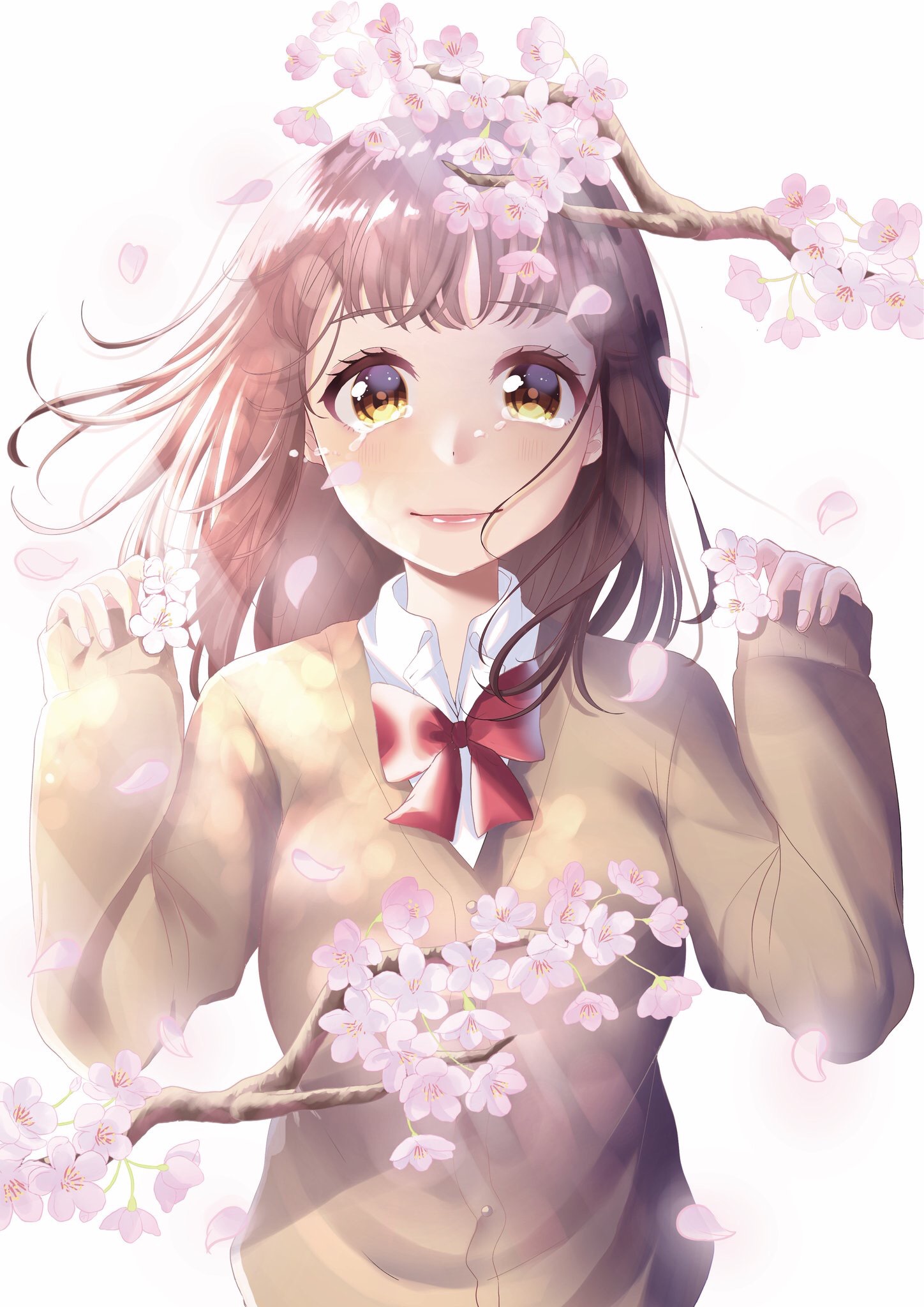 1girlbowbowtiebranchbrown cardiganbrown haircardigancherry blossomscollared shirtlipslong sleeveslooking at viewerpetalsred bowred bowtieschool uniformshirtsleeves past wristssolotearswhite backgroundwhite shirtyellow eyes