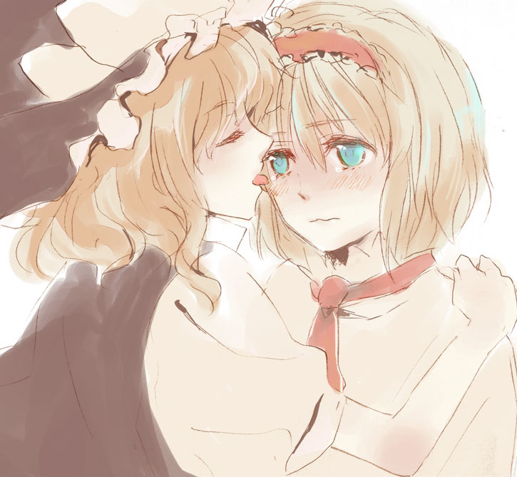 2girlsblonde hairblue eyesblushclosed eyesfemale focushairbandhand on another's shoulderhathuglickinglicking tearsmultiple girlsribbonsadshort hairshytearstonguetongue outwavy mouthwitchwitch hatyuri
