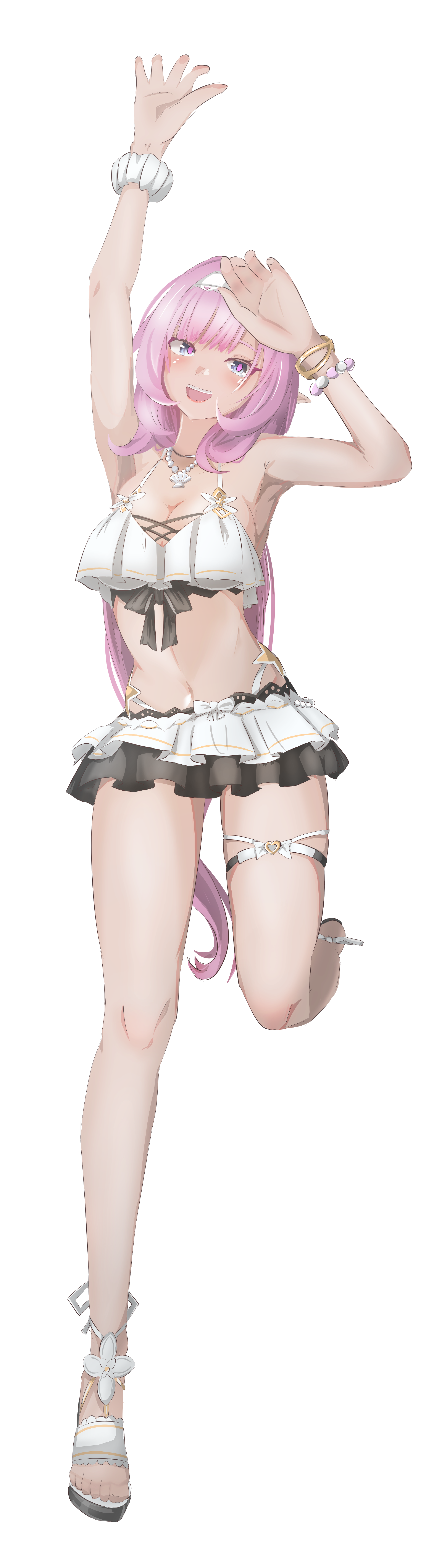 1girlbikinibikini skirtblue eyesbreastscleavagehairbandlarge breastsleg uplong hairnavelofficial alternate costumepink hairsandalsscrunchiesolostomachswimsuitthigh straptoesvery long hairwhite bikiniwhite hairbandwrist scrunchie