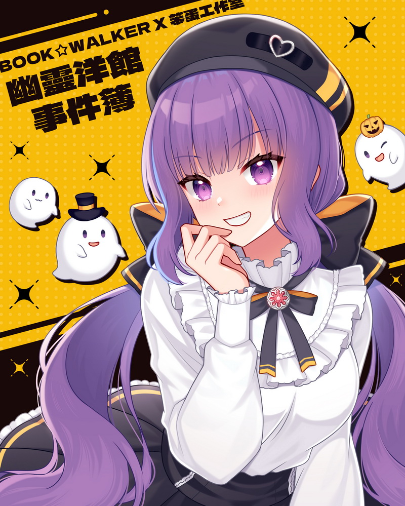 1girlberetblack bowblack hatblack skirtbowbreastsghostgrinhair bowhatlong hairlong sleeveslooking at viewerlow twintailsmahou purinkanmedium breastspleated skirtpuffy long sleevespuffy sleevespurple eyespurple hairshirtskirtsleeves past wristssmilesolotwintailsvery long hairvirtual youtuberwhite shirt