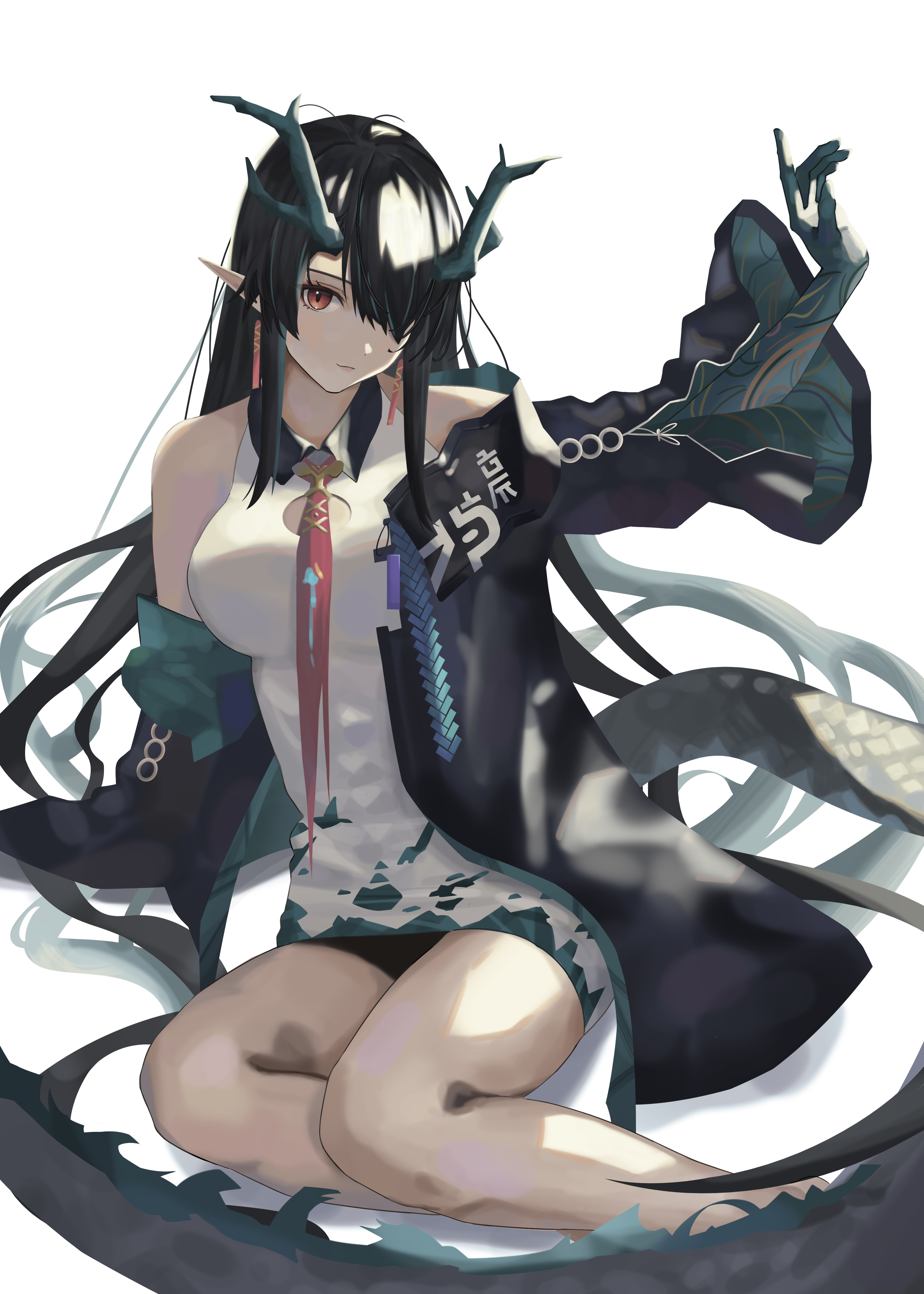 1girlarm upbare shouldersblack hairblack jacketclosed mouthcollared dresscolored extremitiescontrast collardragon girldragon hornsdragon taildressearringsgreen hairhair over one eyehornsjacketjewelrylight smilelong hairlooking at viewermulticolored hairnecktieoff shoulderone eye coveredorange eyespointy earsred necktieshort dresssimple backgroundsittingsleevelesssleeveless dresssolostreaked hairtailtorn clothestorn necktiewhite backgroundwhite dressyokozuwari