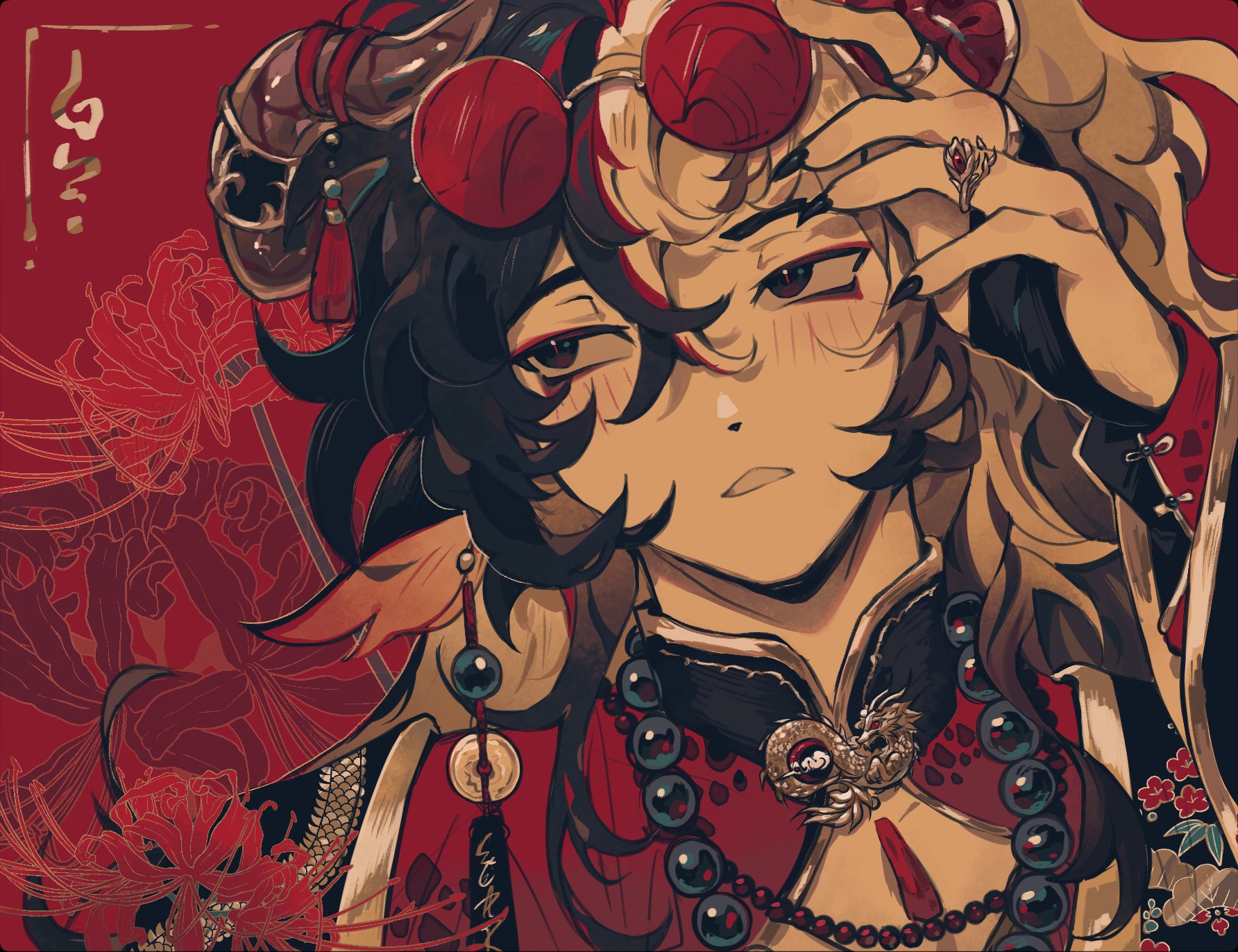 1boybead necklacebeadsblushcoineyelinerfingernailshornsjewelrylimited palettelong hairmakeupmale focusnecklaceparted lipsportraitringround eyewearsharp fingernailssolo