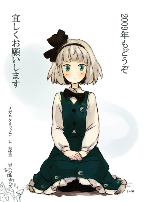 1girlartist namebob cutbowfemale focusgreen eyesgrey hairhair bowhands on laphitodamaseizashort hairsignaturesittingskirtsolovest