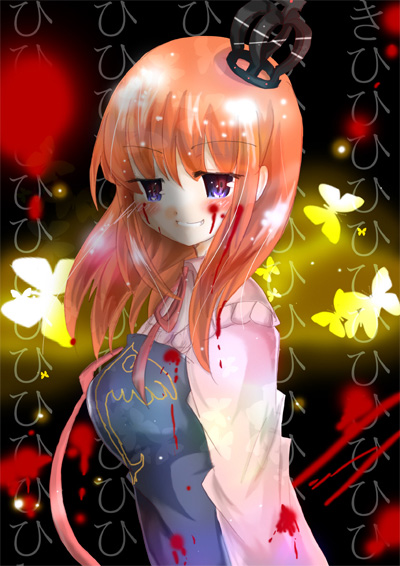 00s1girlbloodblue eyesblushbrown themebugbutterflydressfemale focusinsectorange hairribbonsmilesolo