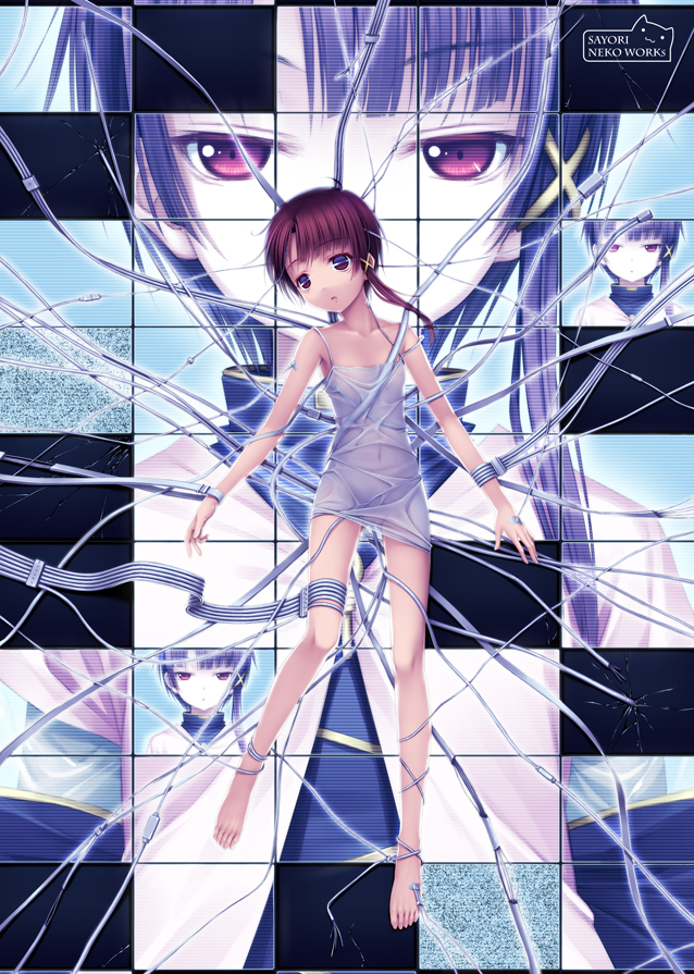 1990s (style)1girlbarefootbrown eyesbrown haircablechemiseelectrodesfeetfull bodyhair ornamenthaircliplolipurple hairred eyesretro artstyleshort hairstrap slipx hair ornament