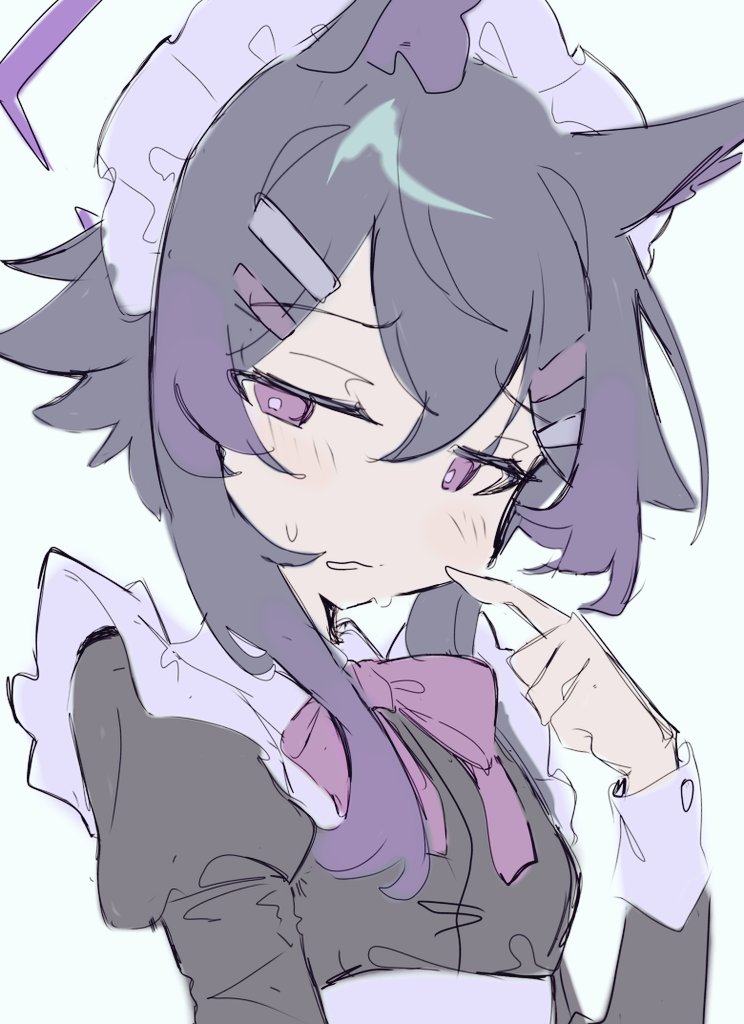 1girlalternate costumeanimal earsblack dressblushbowcat earsdressenmaidedhair between eyeshair ornamenthaircliphaloimro 0000juliet sleeveslong sleevesmaidmaid headdresspuffy sleevespurple eyespurple hairpurple haloshort hair with long lockssimple backgroundsketchsolosweatupper body