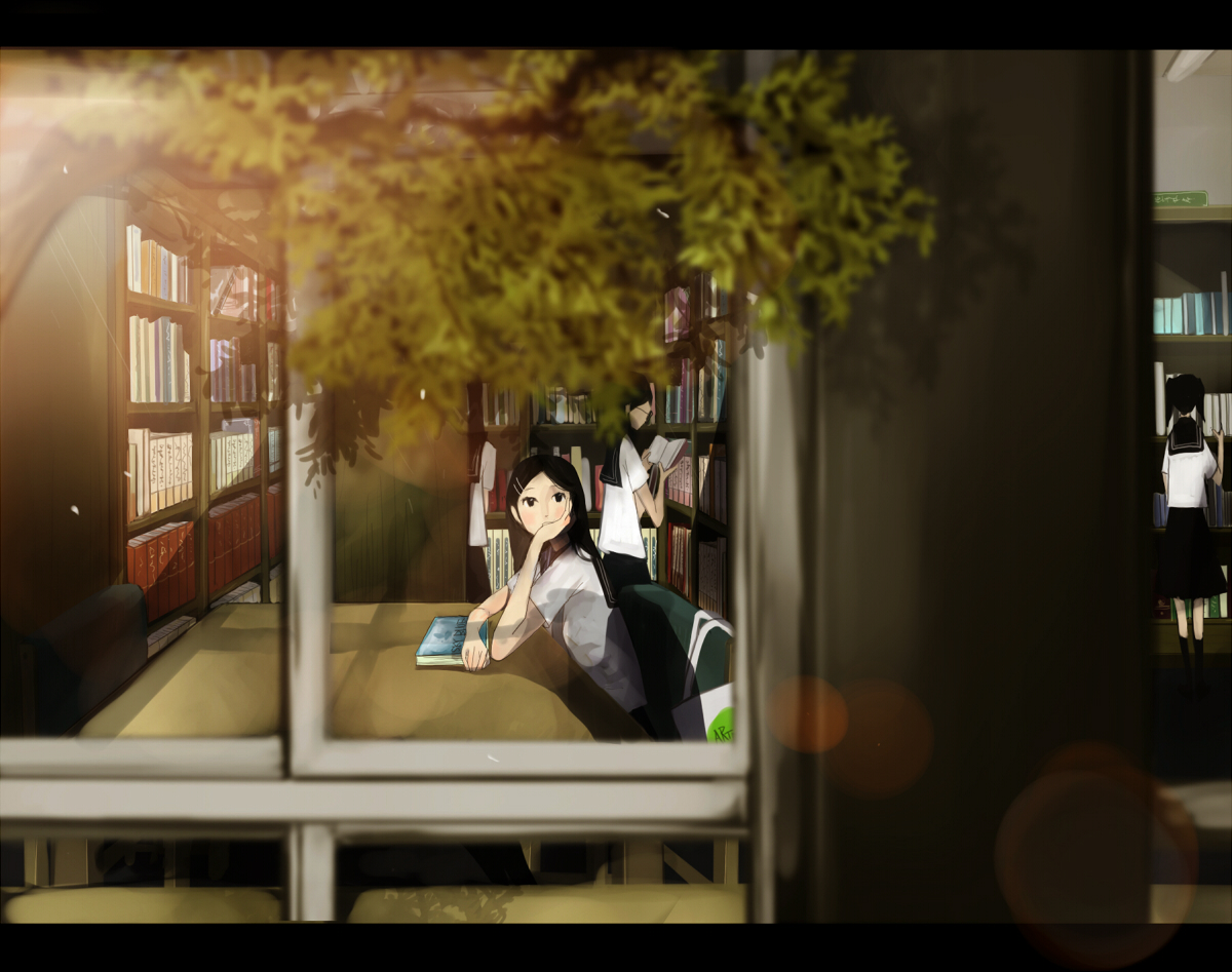 4girlsblack eyesblack hairblurrybookbookshelfdepth of fieldhead restlens flareletterboxedlibrarylooking outsidemultiple girlsopen bookreadingschool uniformsittingslice of lifewindow
