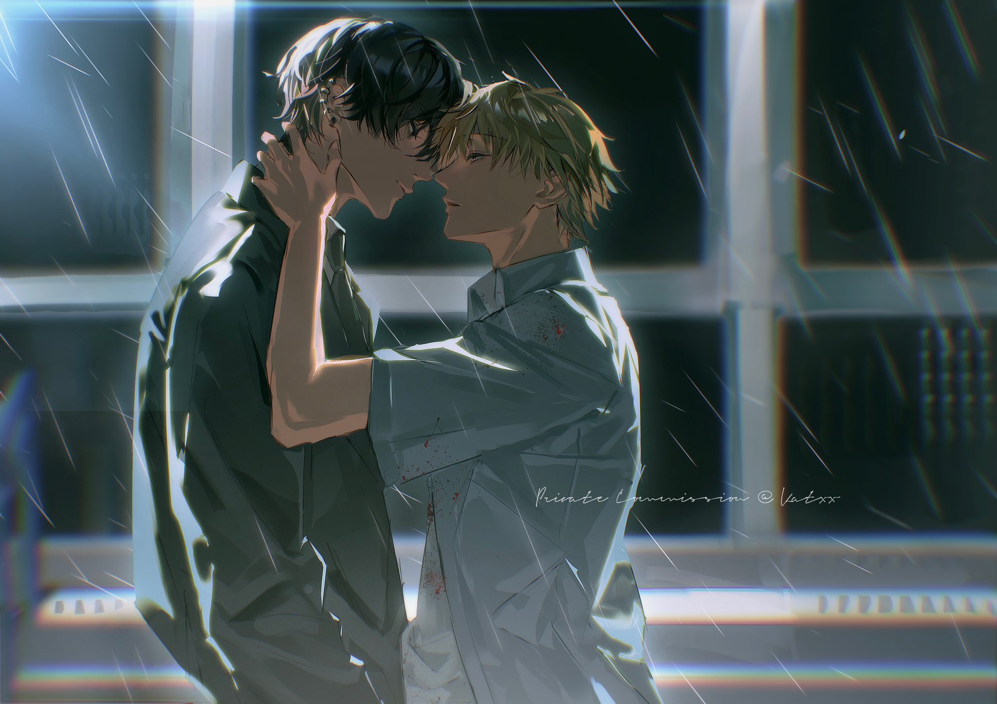 2boysblack hairblack shirtblonde hairclosed mouthcollared shirtear piercingfrom sidehand on another's neckimminent kisskatxx xoxolooking at anothermale focusmultiple boysmultiple piercingspiercingrainshirtshort hairstandingtwitter usernameupper bodywhite shirtyaoi