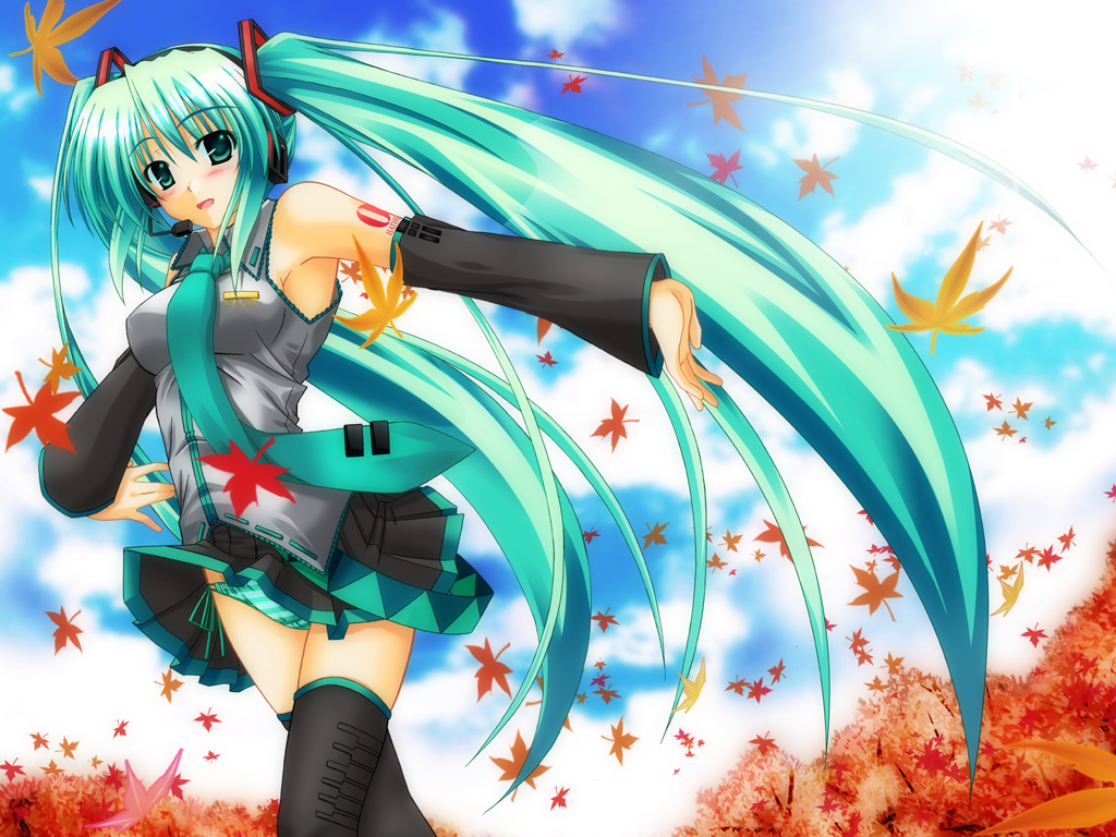 blushclouddetached sleevesgreen eyesgreen hairheadsetleaflong hairnecktiepantiesside-tie pantiesskirtskysolostriped clothesstriped pantiesthighhighstwintailsunderwearvery long hair