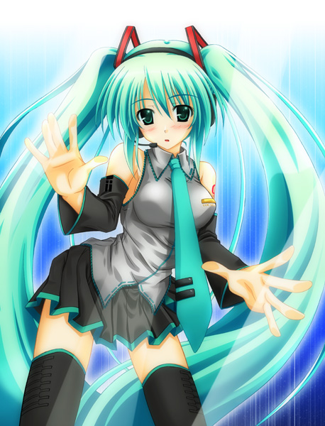 detached sleevesgreen eyesgreen hairheadsetlong hairnecktieskirtthighhighstwintailsvery long hairzettai ryouiki