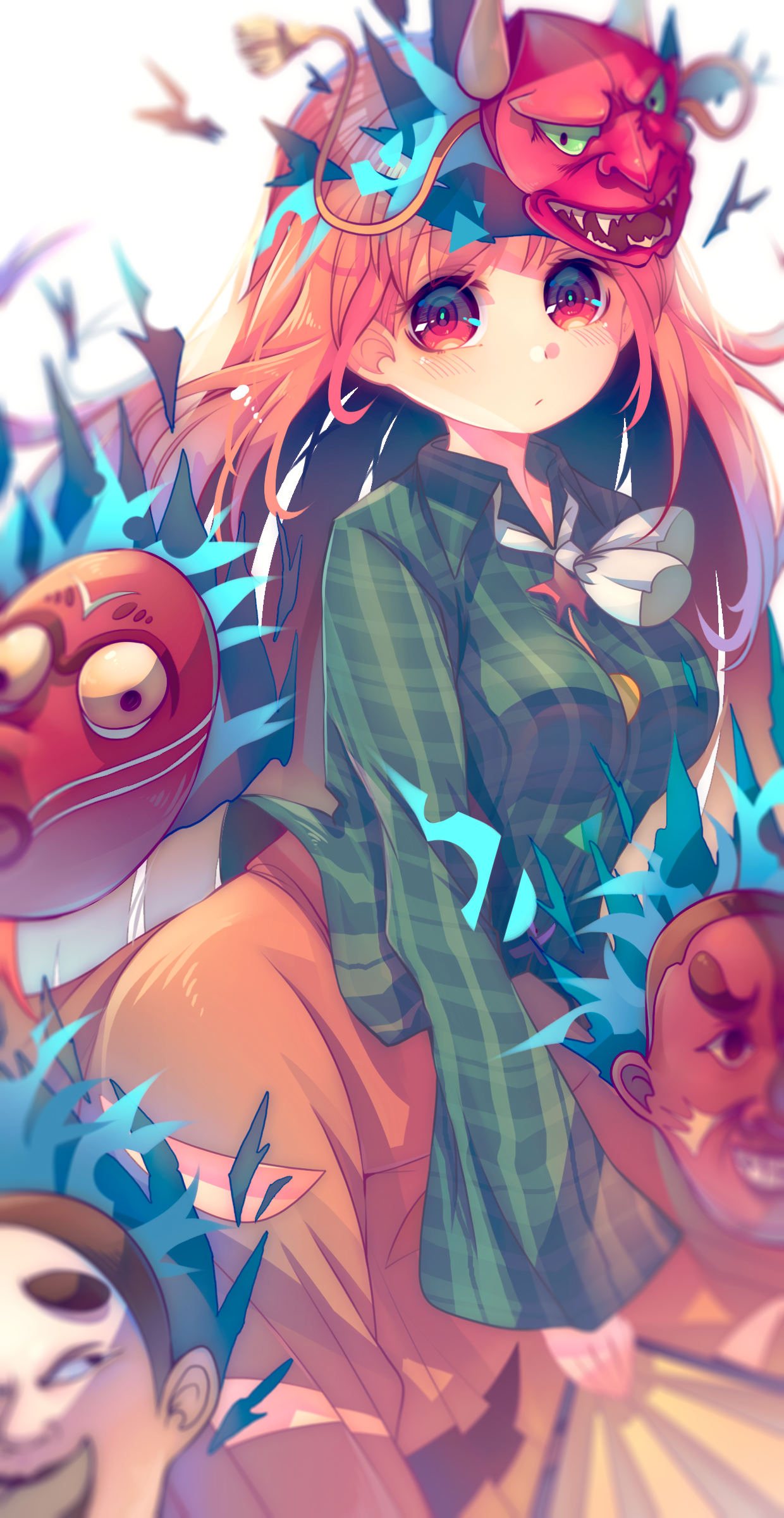 1girlbreastsgreen shirthand fanlong hairlooking at viewermaskmask on headmedium breastsorange skirtplaid clothesplaid shirtred eyesred hairshirtskirtsolo