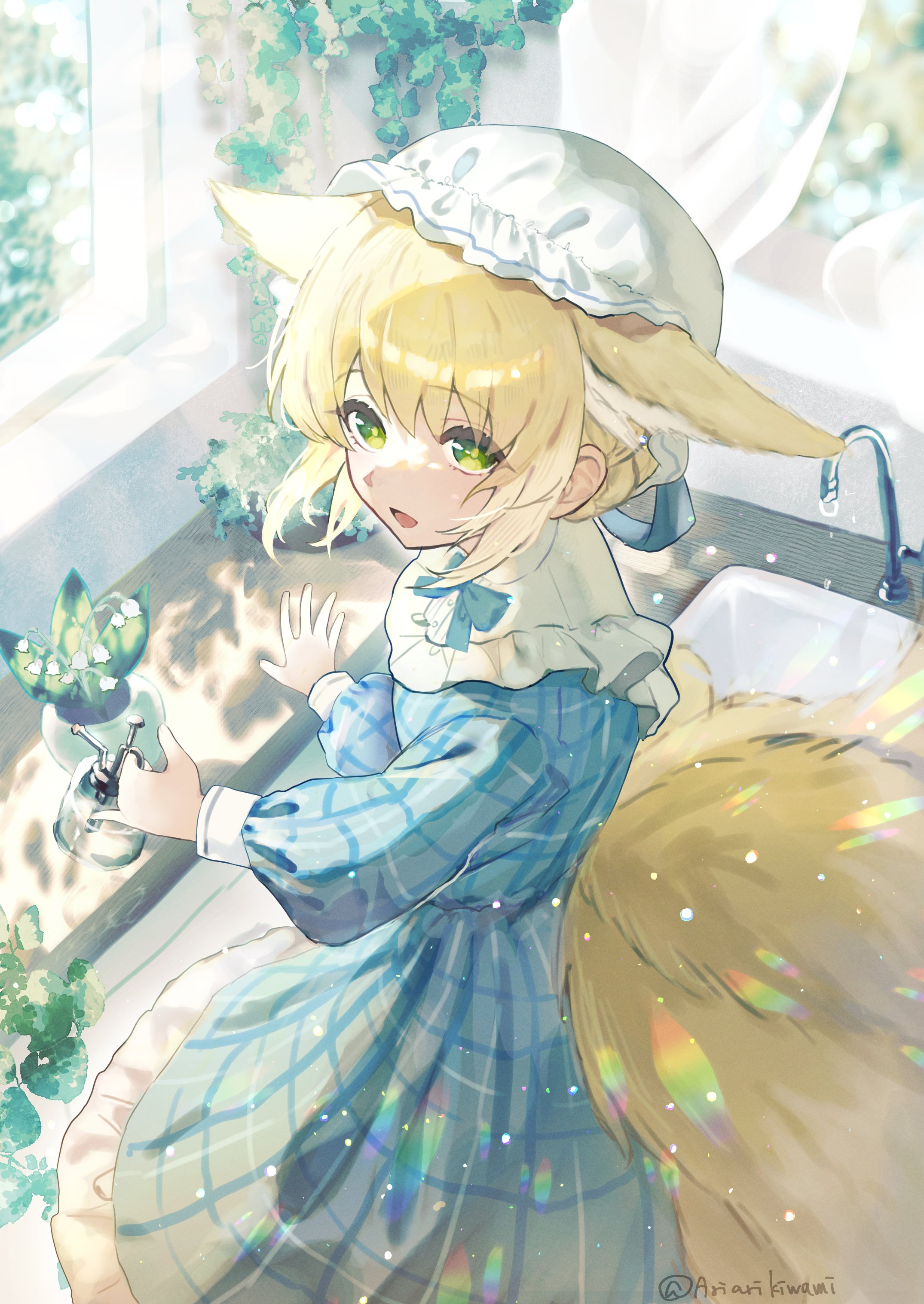 ryuji (red-truth), mozumi pichi, mozumi pichi (roman), v-dere, absurdres, highres, second-party source, 1girl, ahoge, animal ears, artist name, braid, breasts, cleavage, cup, diamond-shaped pupils, diamond (shape), drink, fang, gold necklace, green eyes, hair ornament, holding, holding cup, jewelry, large breasts, lying, necklace, nipples, on side, one breast out, one side up, open mouth, orange hair, panties, red pupils, red tunic, solo, symbol-shaped pupils, tail, tunic, underwear, wolf ears, wolf girl, wolf tail, yellow panties